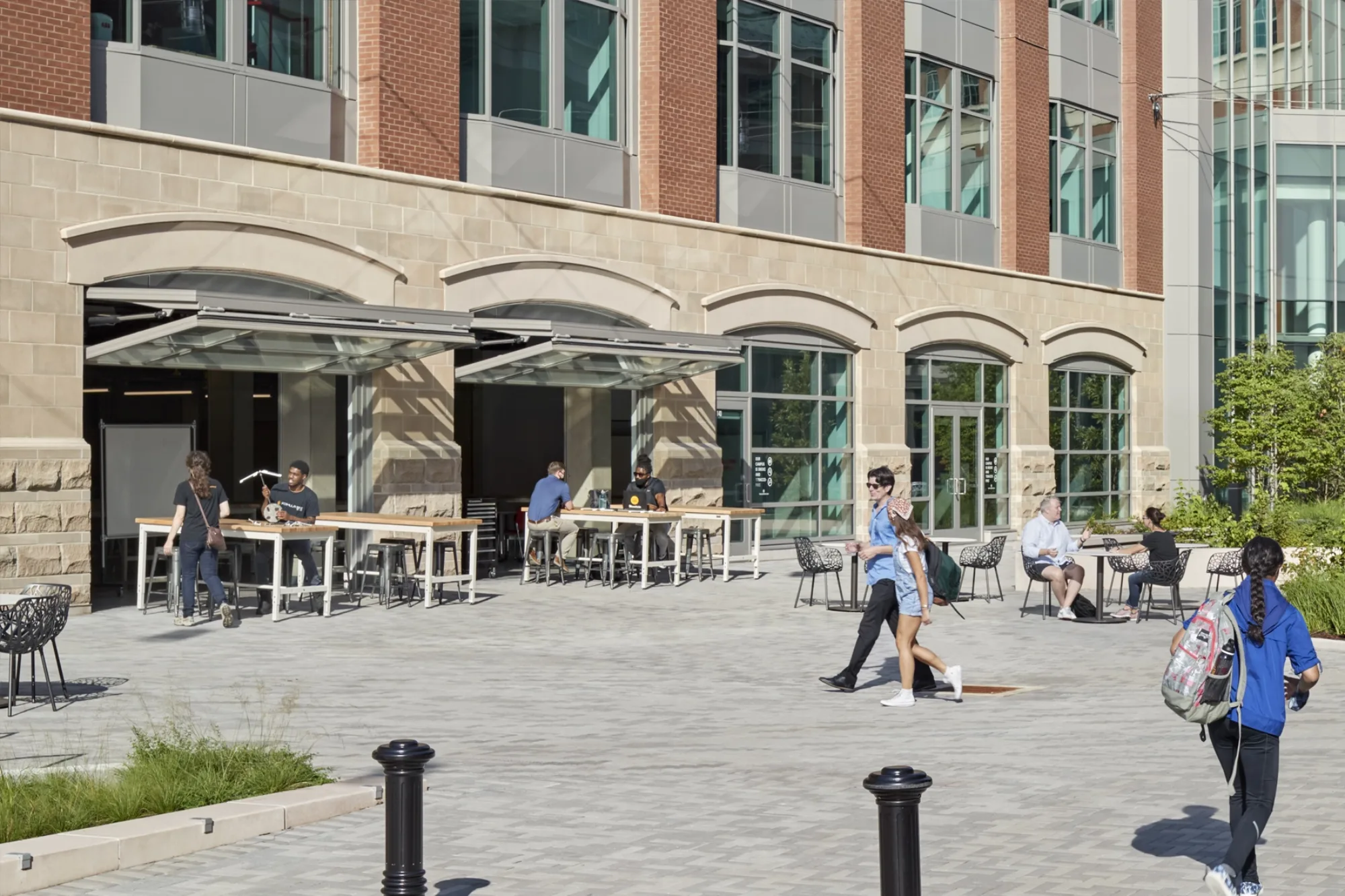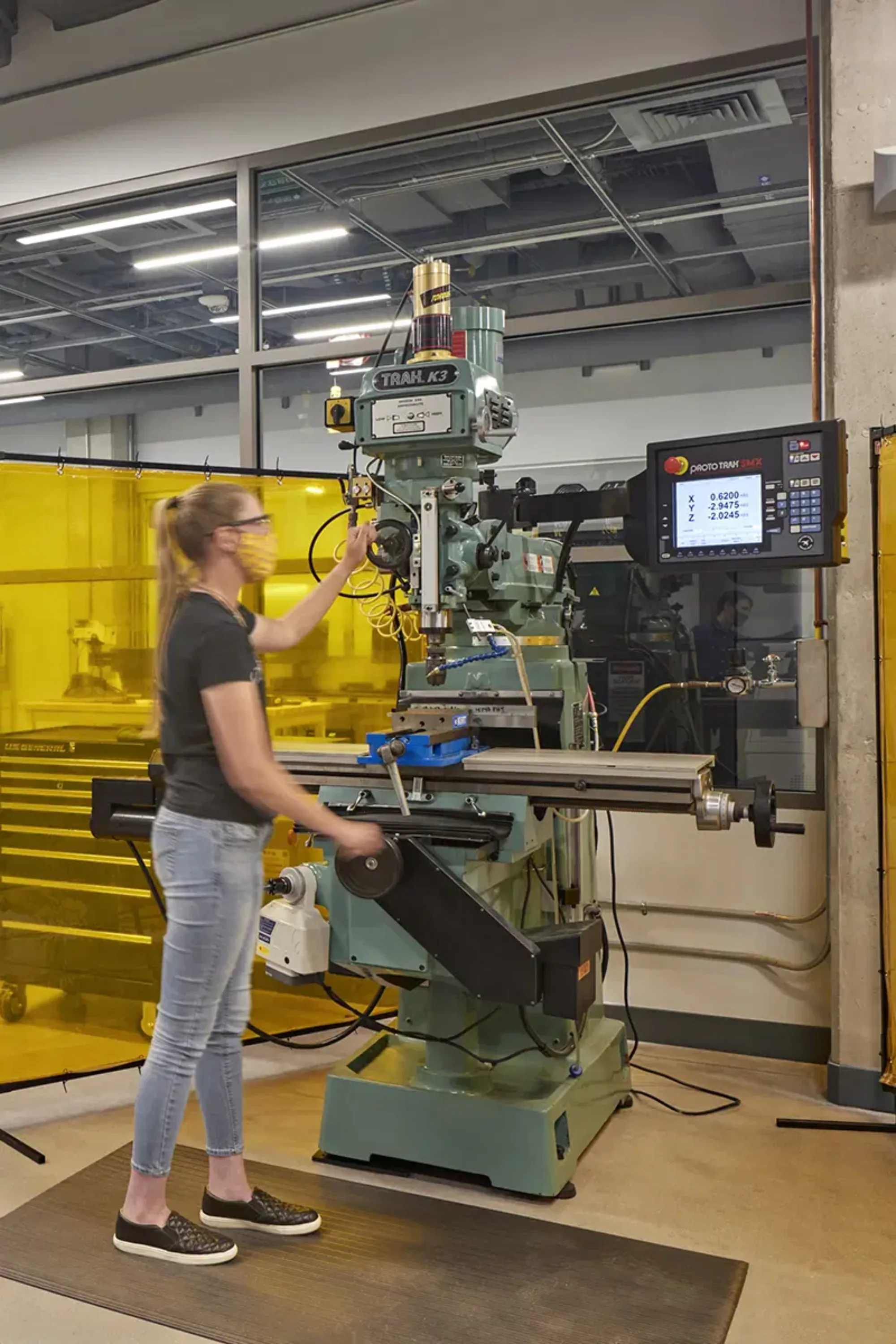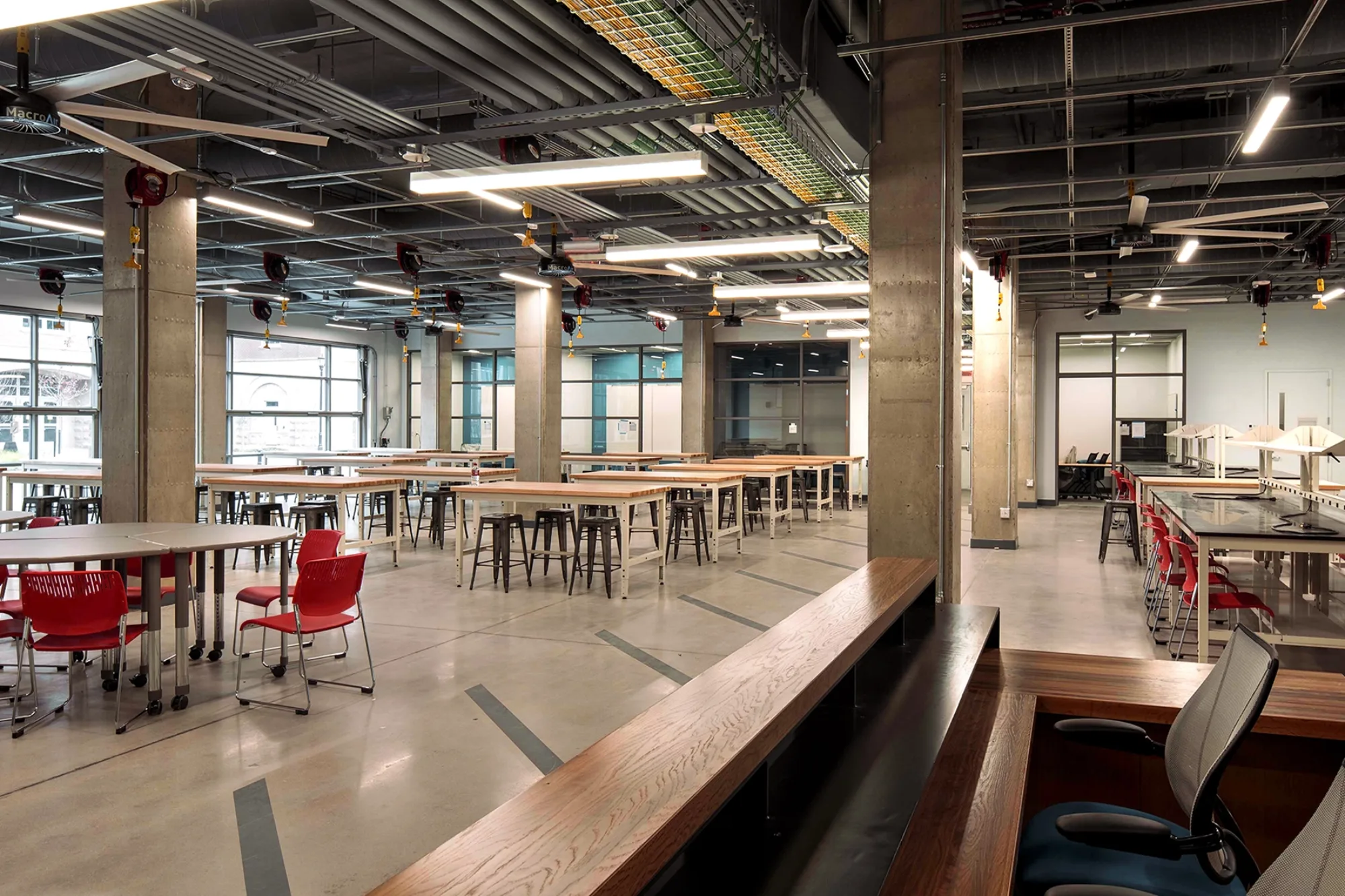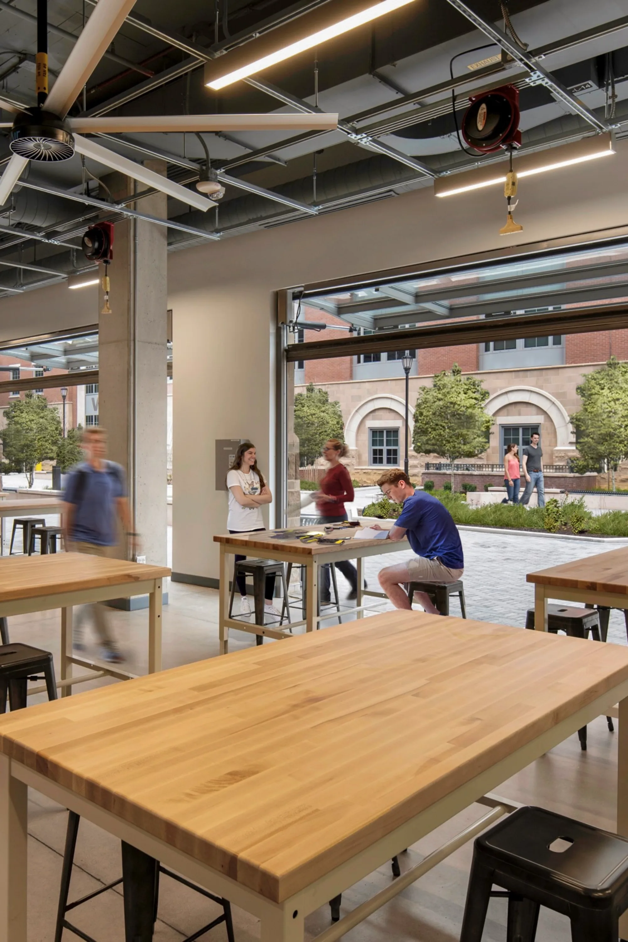 While makerspaces need some degree of access control for safety, it is imperative that they are open and inviting to students that are traditionally outside the maker community. The design/maker lab should be positioned prominently so that the activity inside is highly visible and potentially engaging to all students. The spaces must be designed with architecturally durable materials, be served by robust infrastructure and overhead services, and be animated by ample daylight.