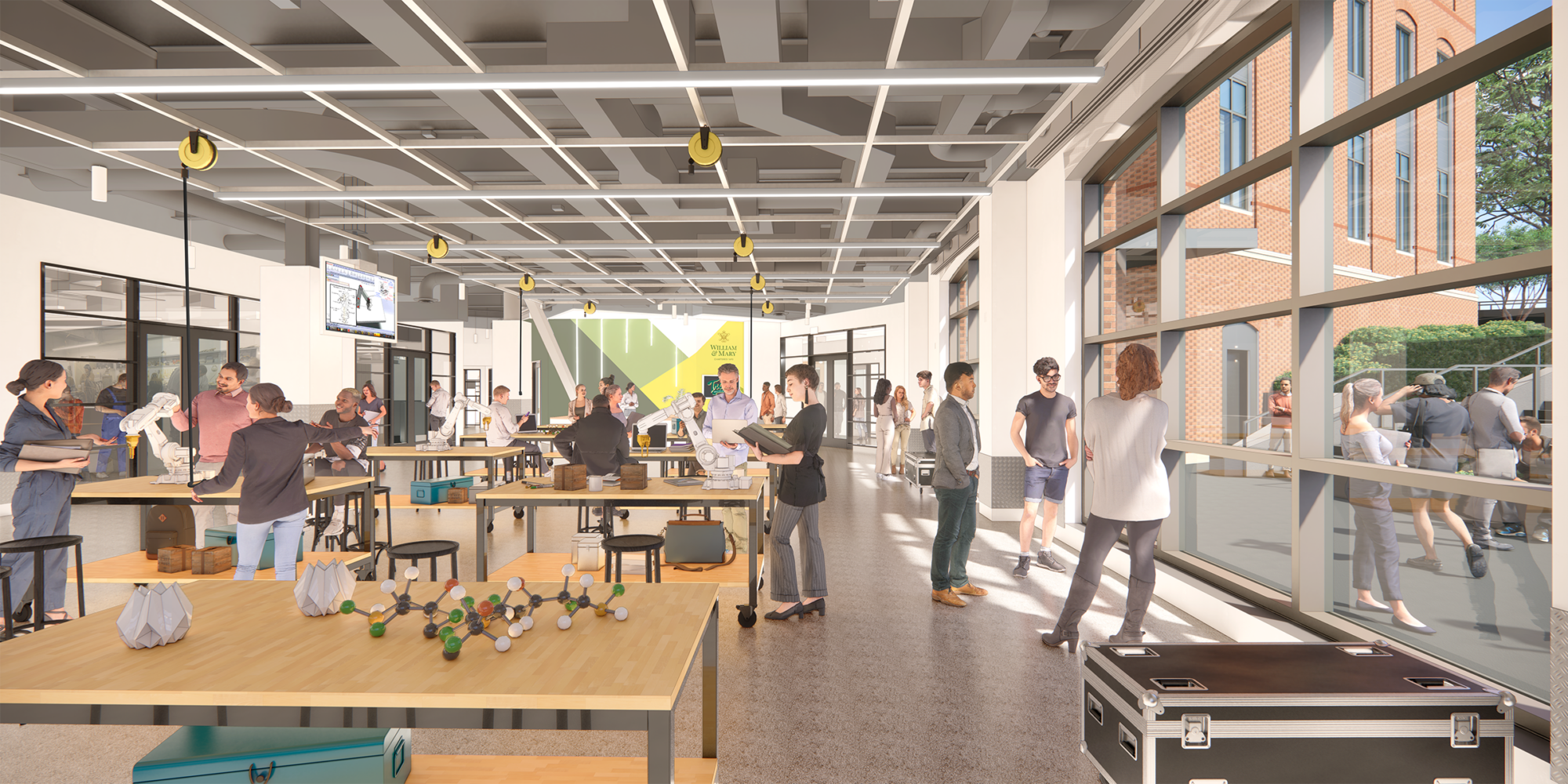 The convergence principles of diversity and connectivity are expressed through the architecture of the Design and Engineering makerspaces at William & Mary. Designed to maximize openness and visibility, these spaces seek to promote interdisciplinary collaboration and amplify the community’s entrepreneurial efforts. They will bring together people with vastly different experiences around shared interests—sparking new ways of thinking, doing, and making. The design lab and material fabrication labs in ISC4 are the final program pieces which, when paired with the interdisciplinary research labs and instruction space in the building, will create a more resilient research and innovation system. The addition of these new resources helps build connective pathways within, and helps students and faculty collaborate and engage at, different points along that innovation system.