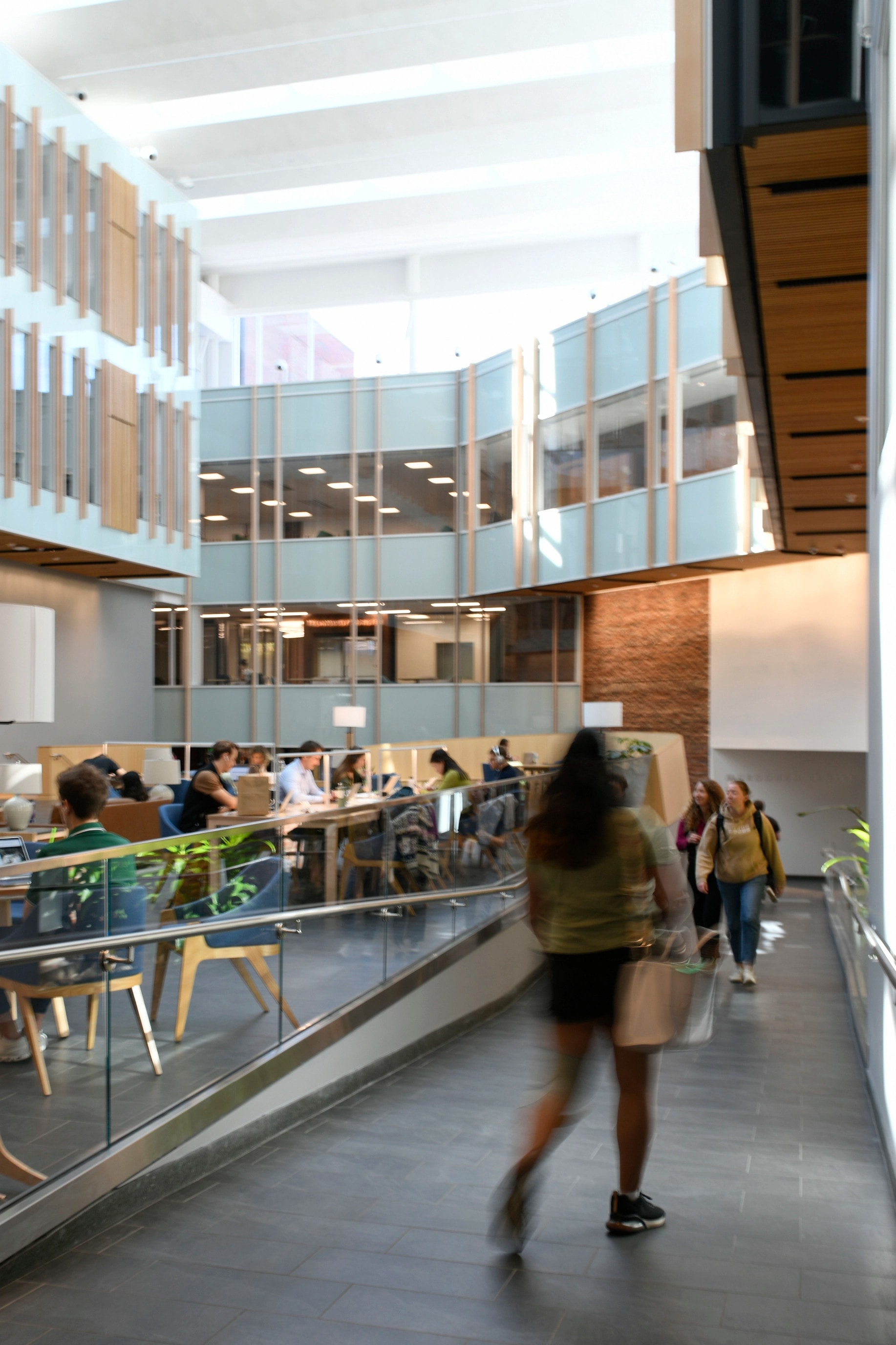 The atrium unites old and new structures and provides an accessible pathway through the ensemble. User group feedback was essential to designing a project that is inclusive of groups historically left out of STEM spaces. Participants helped shape the design of the atrium, inclusive restrooms, accessible kitchens, and mother’s room.