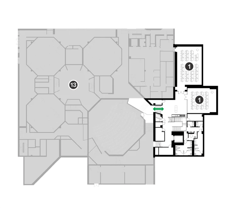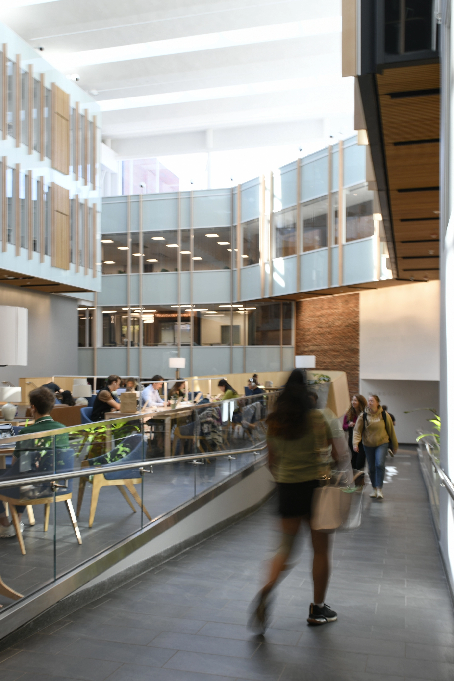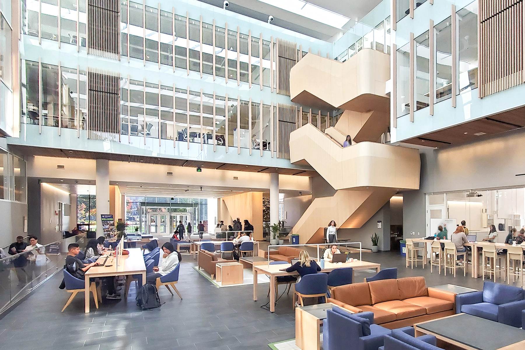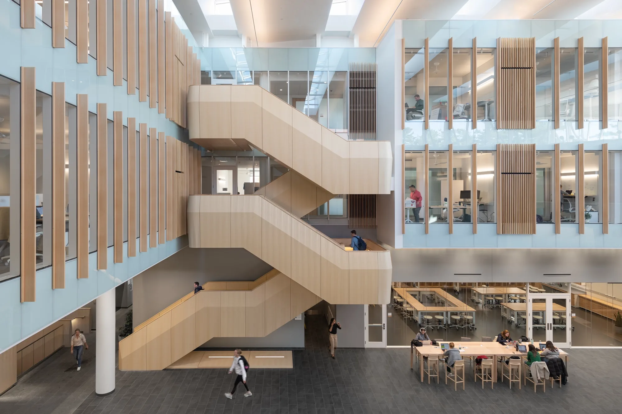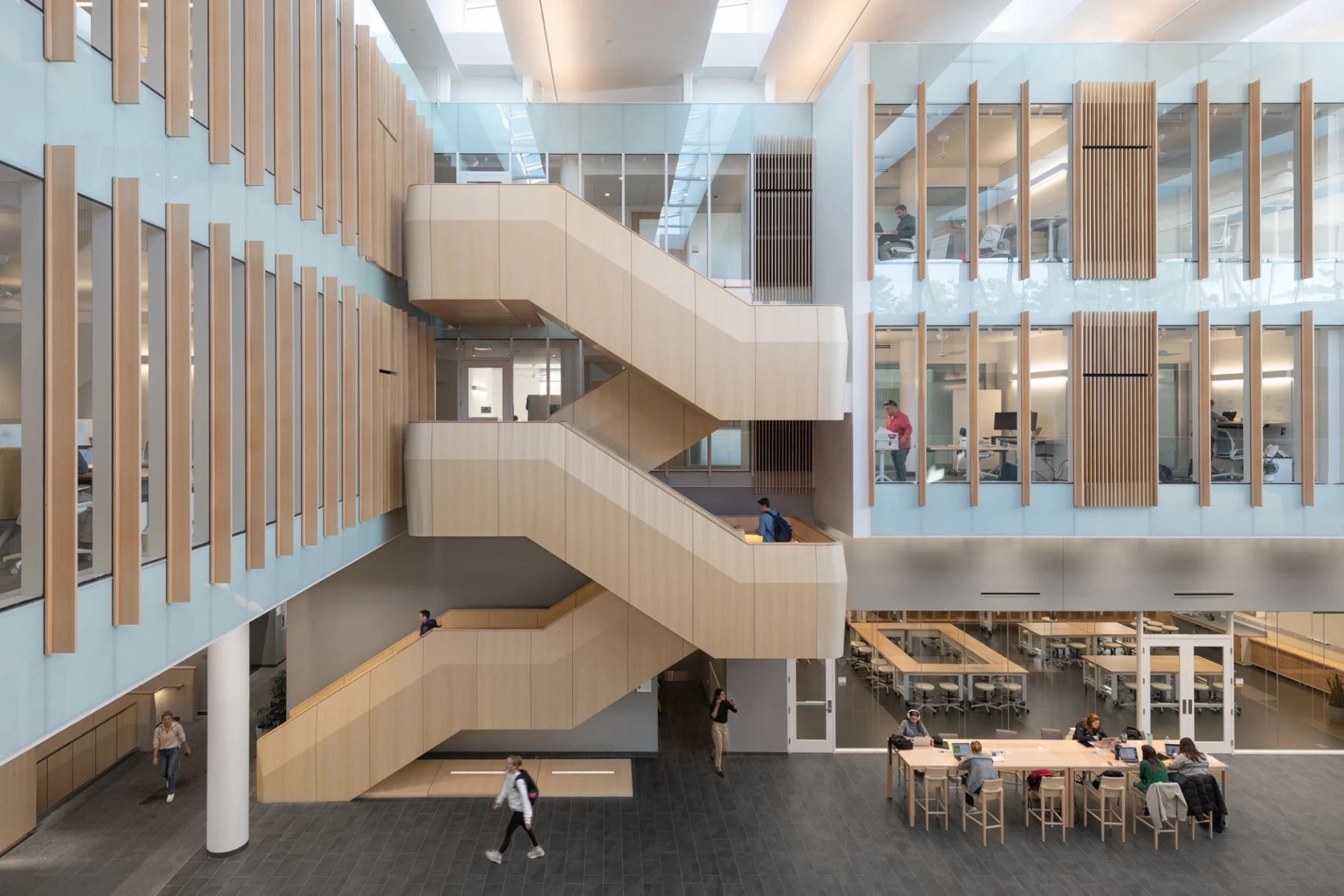 The atrium unites old and new structures and provides an accessible pathway through the ensemble. User group feedback was essential to designing a project that is inclusive of groups historically left out of STEM spaces. Participants helped shape the design of the atrium, inclusive restrooms, accessible kitchens, and mother’s room.