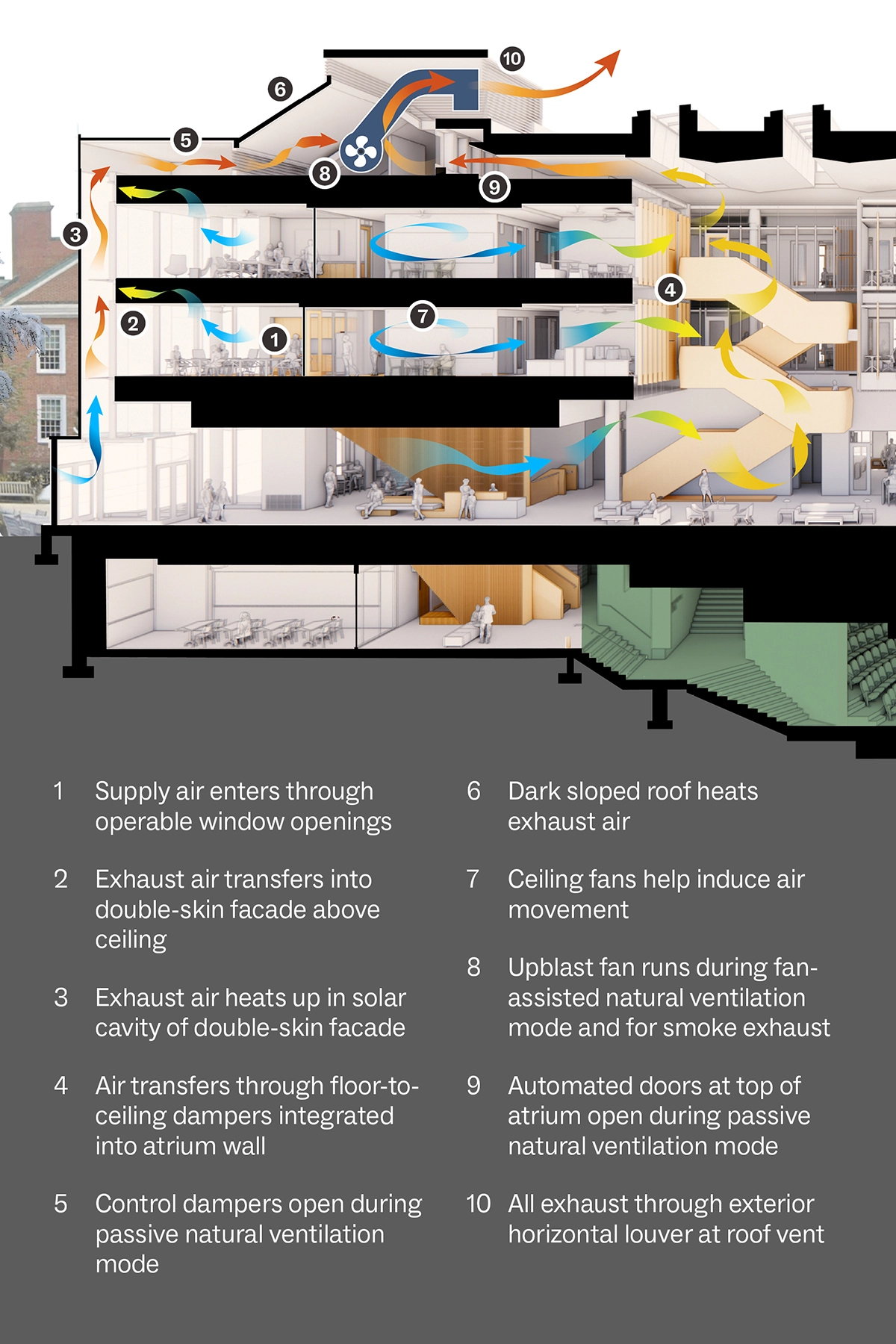Based on the team’s analysis of future weather data, Hanover will experience a 75%–130% increase in cooling degree days by the end of the century. The building’s innovative, architecturally integrated cooling and ventilation strategies will help it meet future needs. 83% of occupied spaces are served by the automated natural ventilation system.