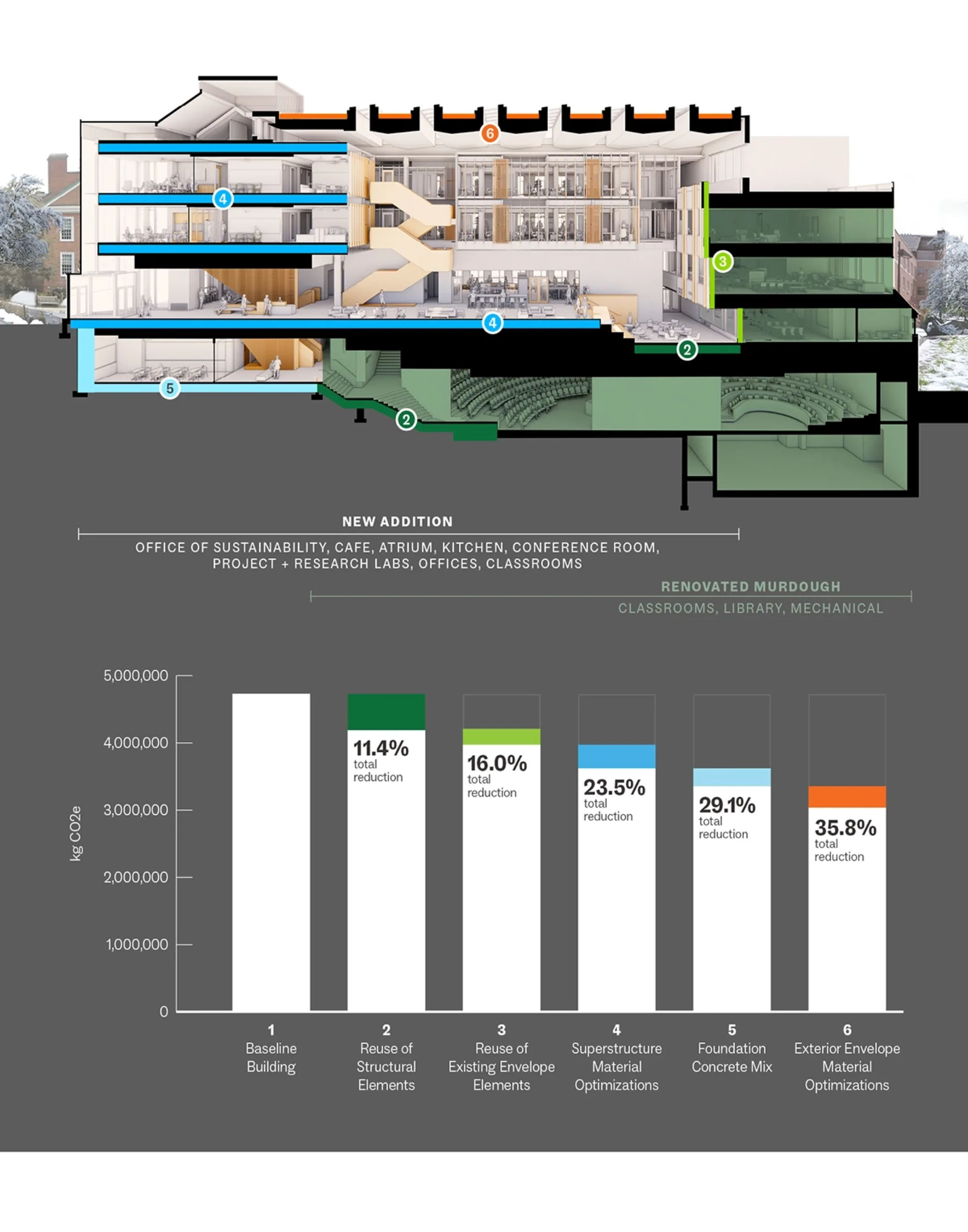 Physically weaving together old and new structures resulted in embodied carbon savings (through material reductions) and operational carbon savings (through system upgrades) to support campuswide decarbonization goals.