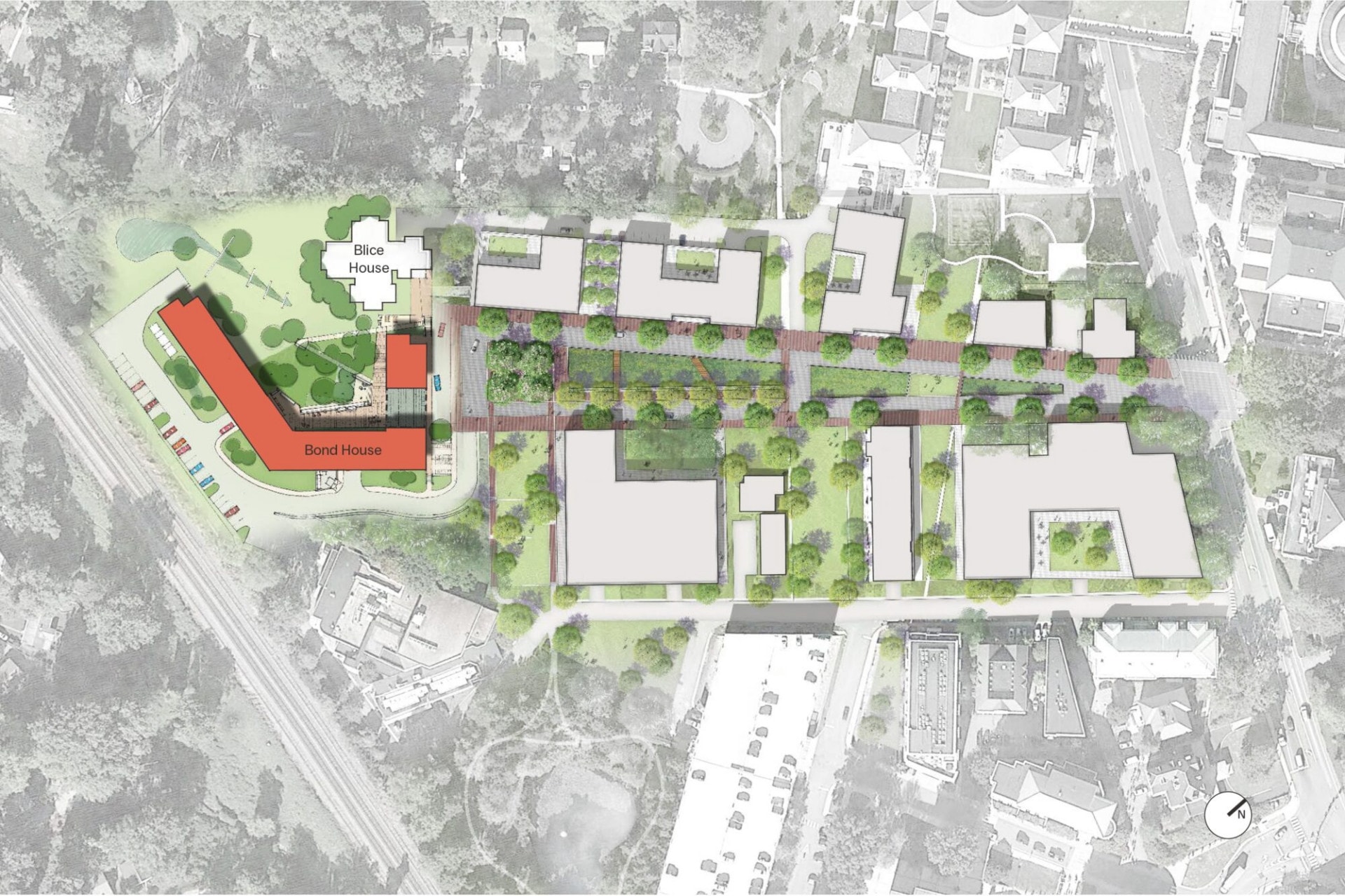 Bond House had fewer conditions constraining its response to its axis than the Irving Institute or Chao Center. Existing buildings on Brandon Avenue were clad in traditional UVA brick and cast stone trim, and new construction was required to follow suit, with height limitations clearly defined, but Brandon Avenue was not part of the historic campus core, and the Bond House site was not located opposite another building. The axis it needed to respond to, therefore, consisted entirely of the unique, functional green space leading to its site.