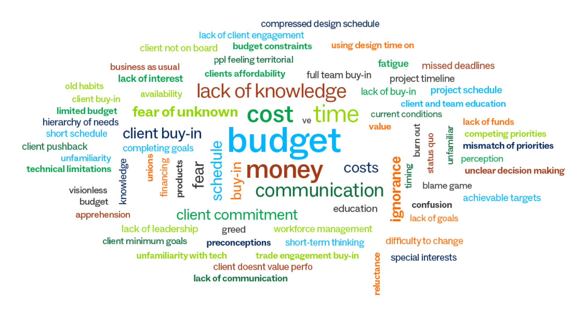 The survey began by asking what are the most common barriers that prevent a project from reaching its intended goals. We wanted to understand the hurdles between the design vision and the advanced targets many of us hope to meet. Common responses included the client and their priorities, conservatism, resistance to change, budget, and the investment level of the team throughout all stages of design.