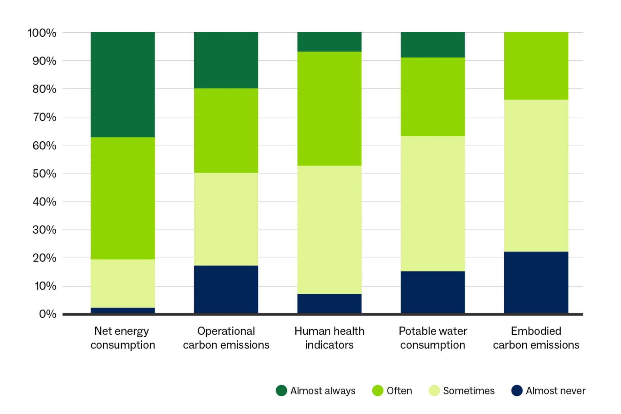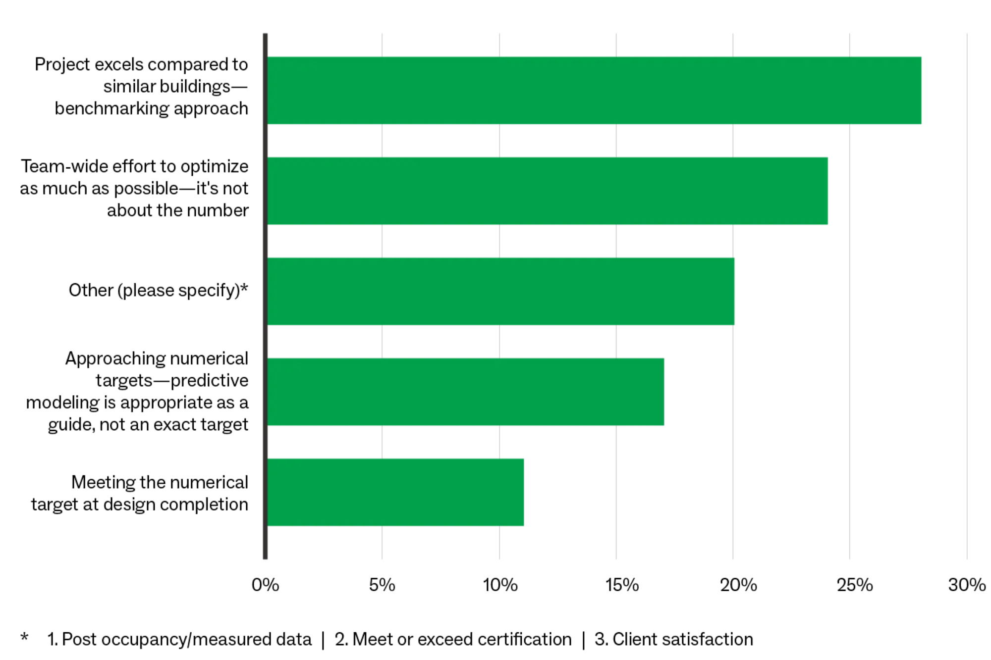 Though these quantitative targets are necessary and effective, the majority of professionals don’t believe that hitting a numerical target at design completion is the most important marker of success. Based on this feedback, perhaps the most important role that quantitative targets play is as proxies—mechanisms for pushing teams to optimize and excel—rather than specific targets to hit. On each project, it’s crucial to understand the motivation behind goals and ultimate vision to make sure the team is evaluating the right results.
