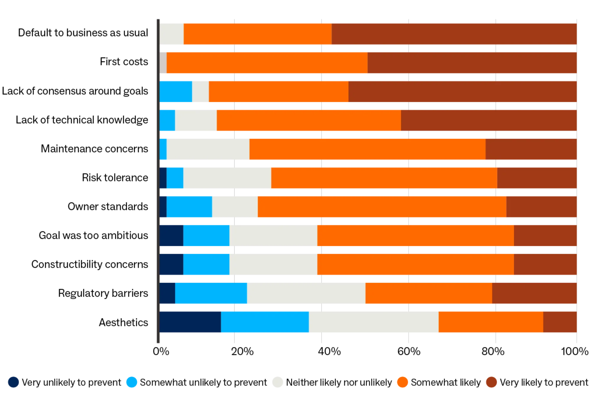 Most respondents confirmed that a range of factors, from risk tolerance to constructability, maintenance concerns, and regulatory barriers are at least somewhat likely to prevent a project from achieving its goals.