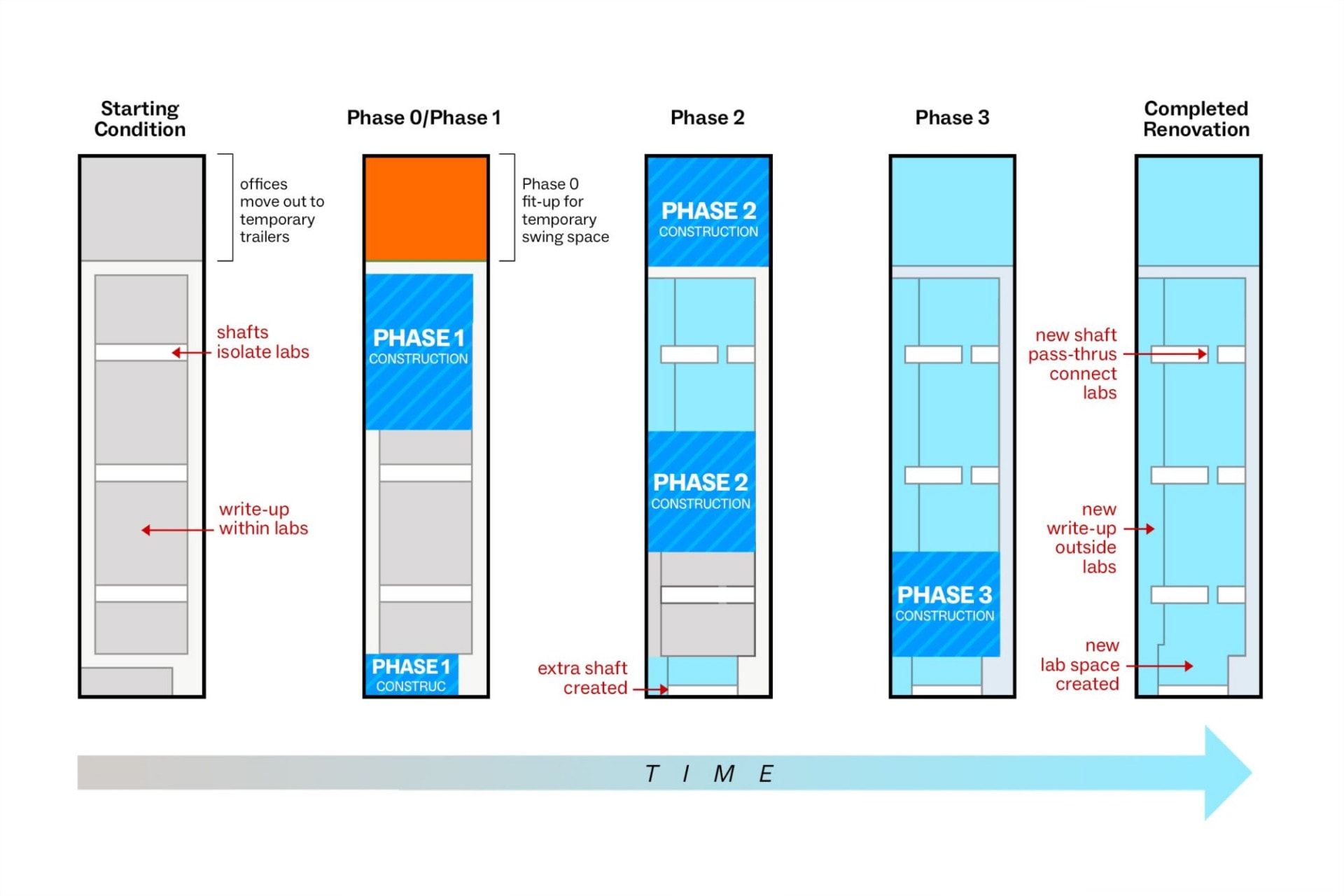 Because most of these buildings must continue to function as active lab and classroom spaces while they’re being renovated, design teams frequently develop a multi-phase plan to renovate individual portions of a structure. This involves precise sequencing of construction activities to ensure the building will remain a safe, productive, non-disruptive environment as it is being transformed.