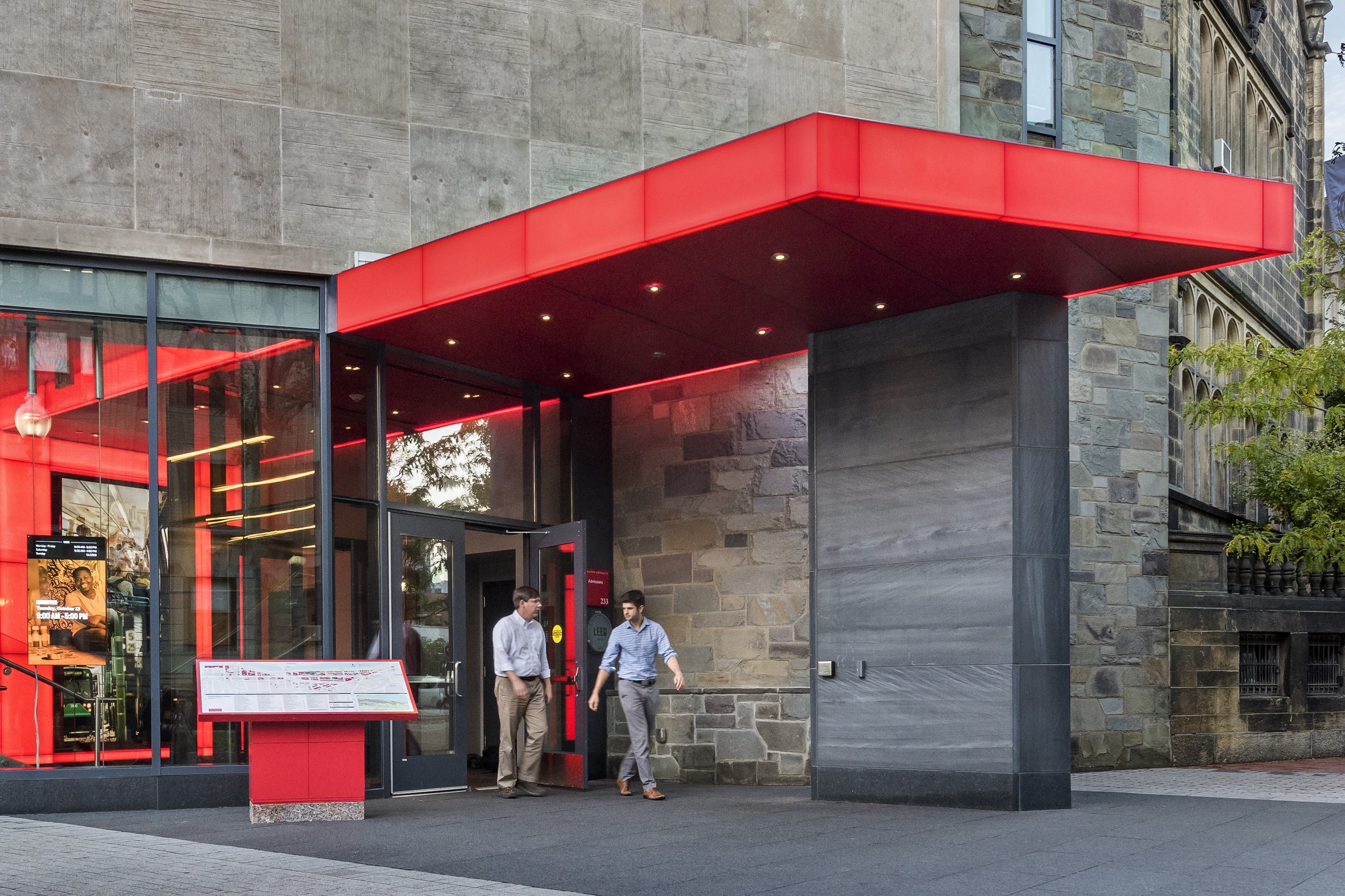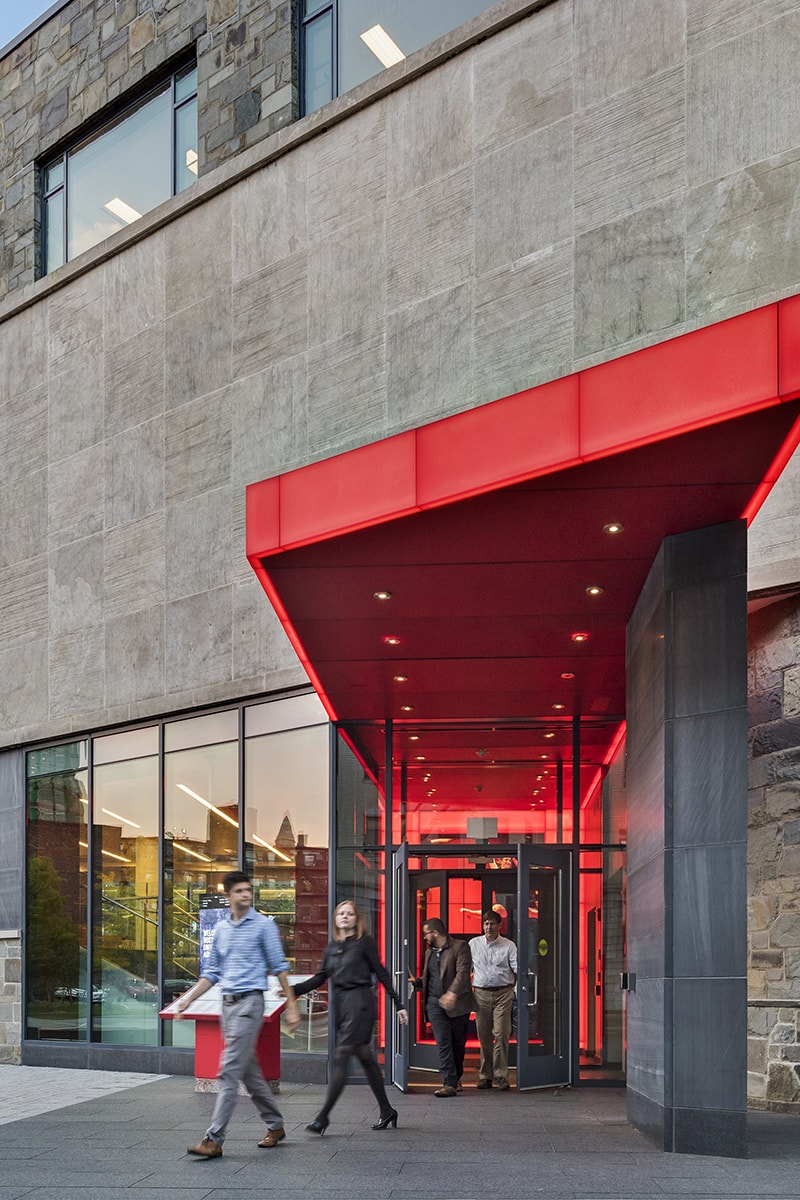 Outside, the building’s site has been transformed. Widened sidewalks and the conversion of a parking lot to a plaza minimize car traffic and increase pedestrian access and safety. Benches, plantings, and lighting make the center a welcome outdoor amenity in this dense urban campus. A distinctive red canopy at the new main entrance—now on-grade and accessible—extends to the street and beckons visitors from several blocks away.