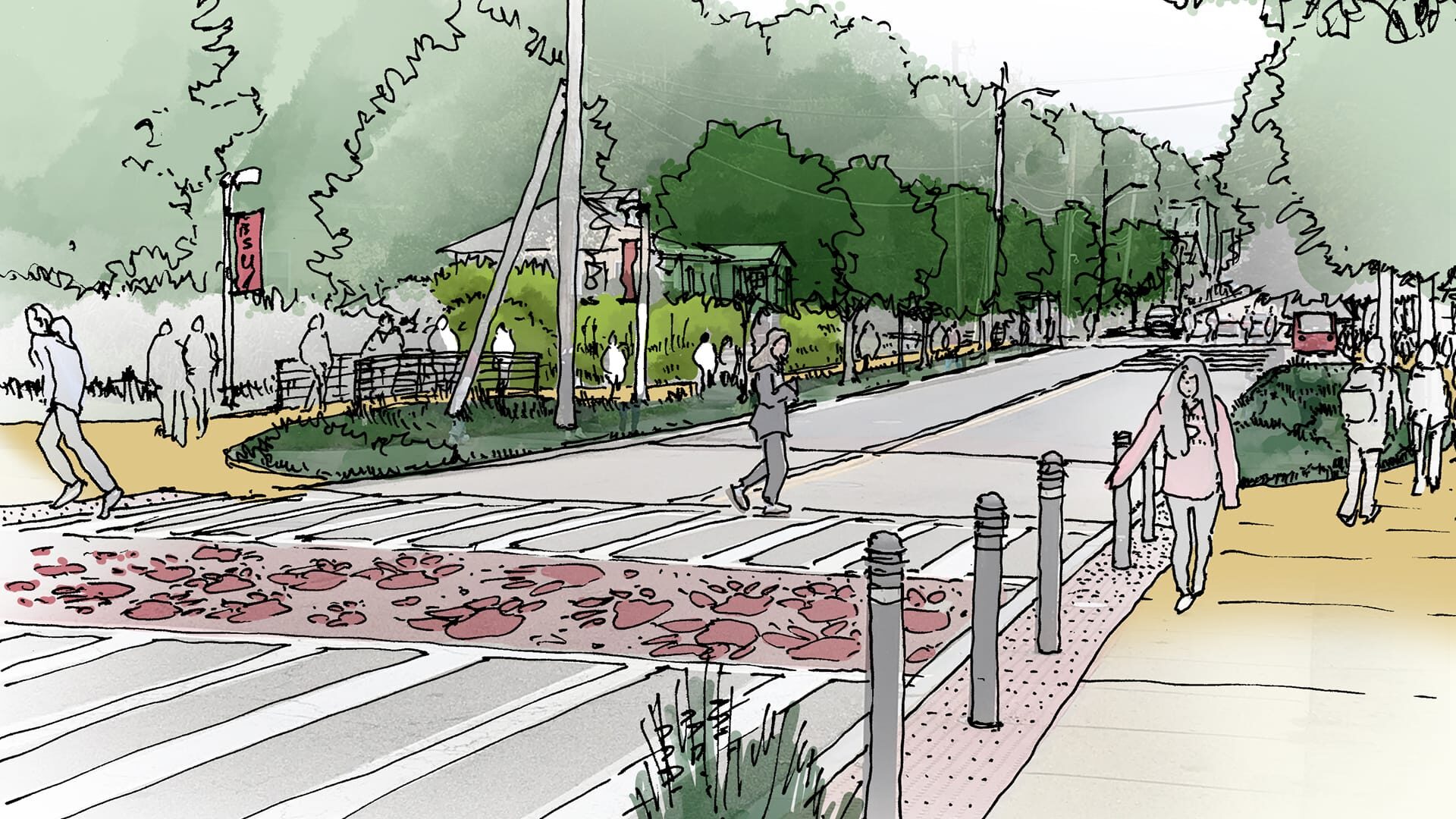 Of town streets improved for pedestrian safety and coherence with campus sense of place