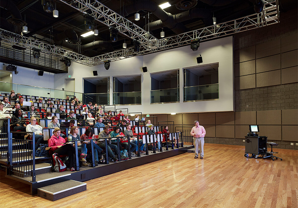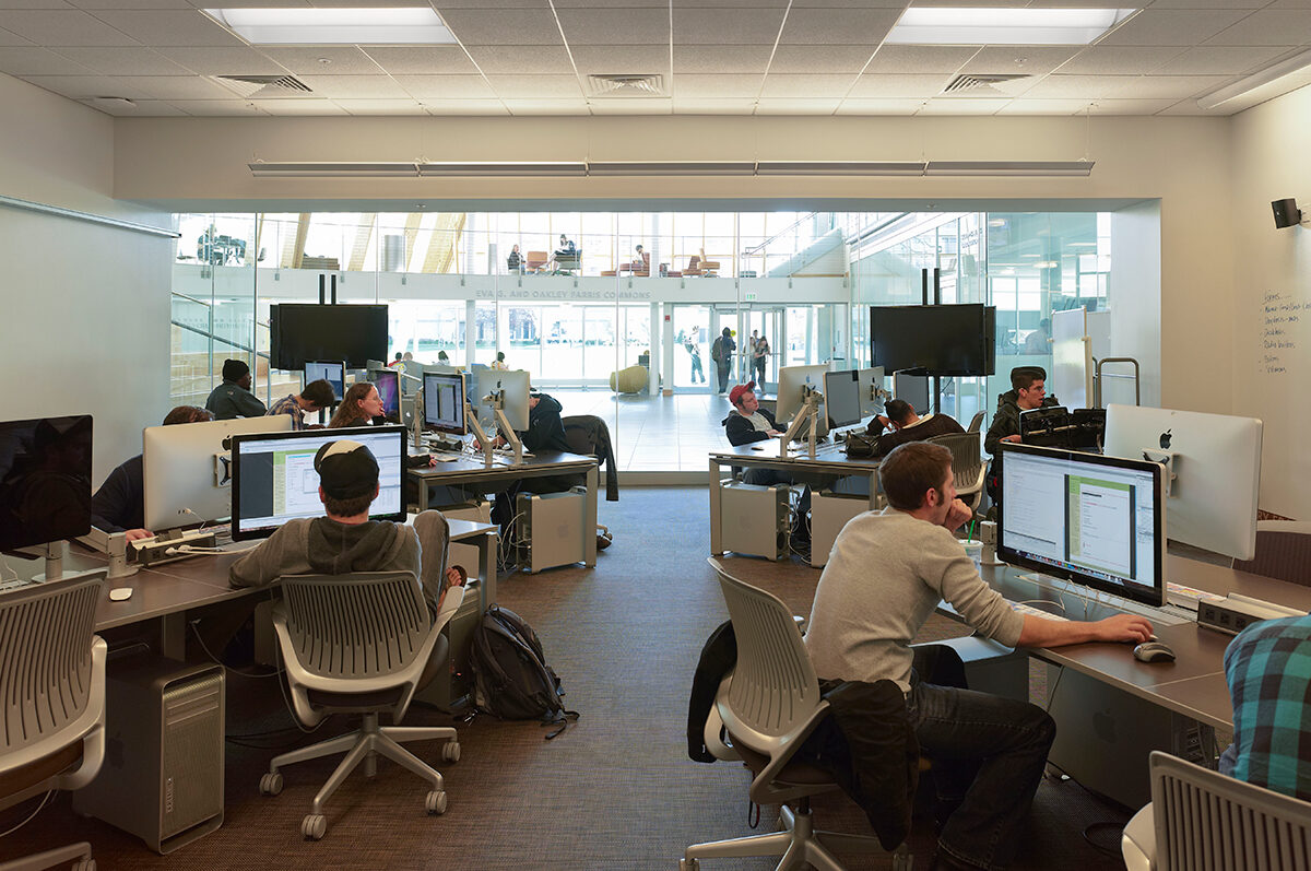 With little precedent for a building with this mix of programs, the Center for Informatics is unique in providing a space that integrates technology and the arts, allowing it to support technically skilled students with a broad range of other interests and capabilities. Today, Griffin Hall is a vibrant campus facility enriched by state-of-the-art labs and studios, inviting collaboration spaces, and immersive experiential learning environments, including the “Digitorium,” a flexible, tech-rich, two-story space that hosts a range of interactive experience for gaming, simulation, performance, teaching, and research.