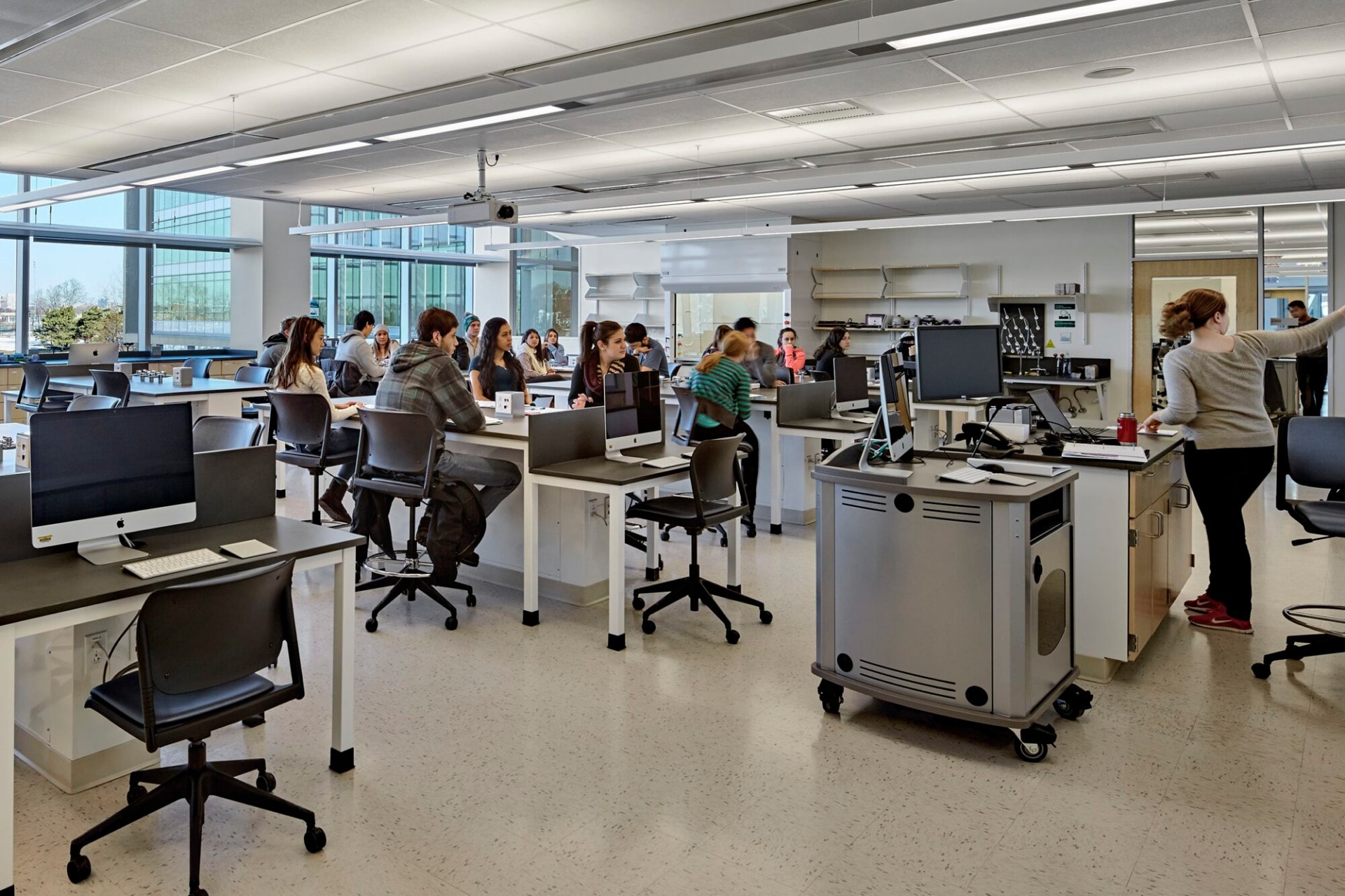 Departments are distributed across multiple floors, grouping researchers by affinities with departmental counterparts. The open plan labs facilitate space and equipment sharing, encourage interdisciplinary research and collegiality, and accommodate changes in research focus.