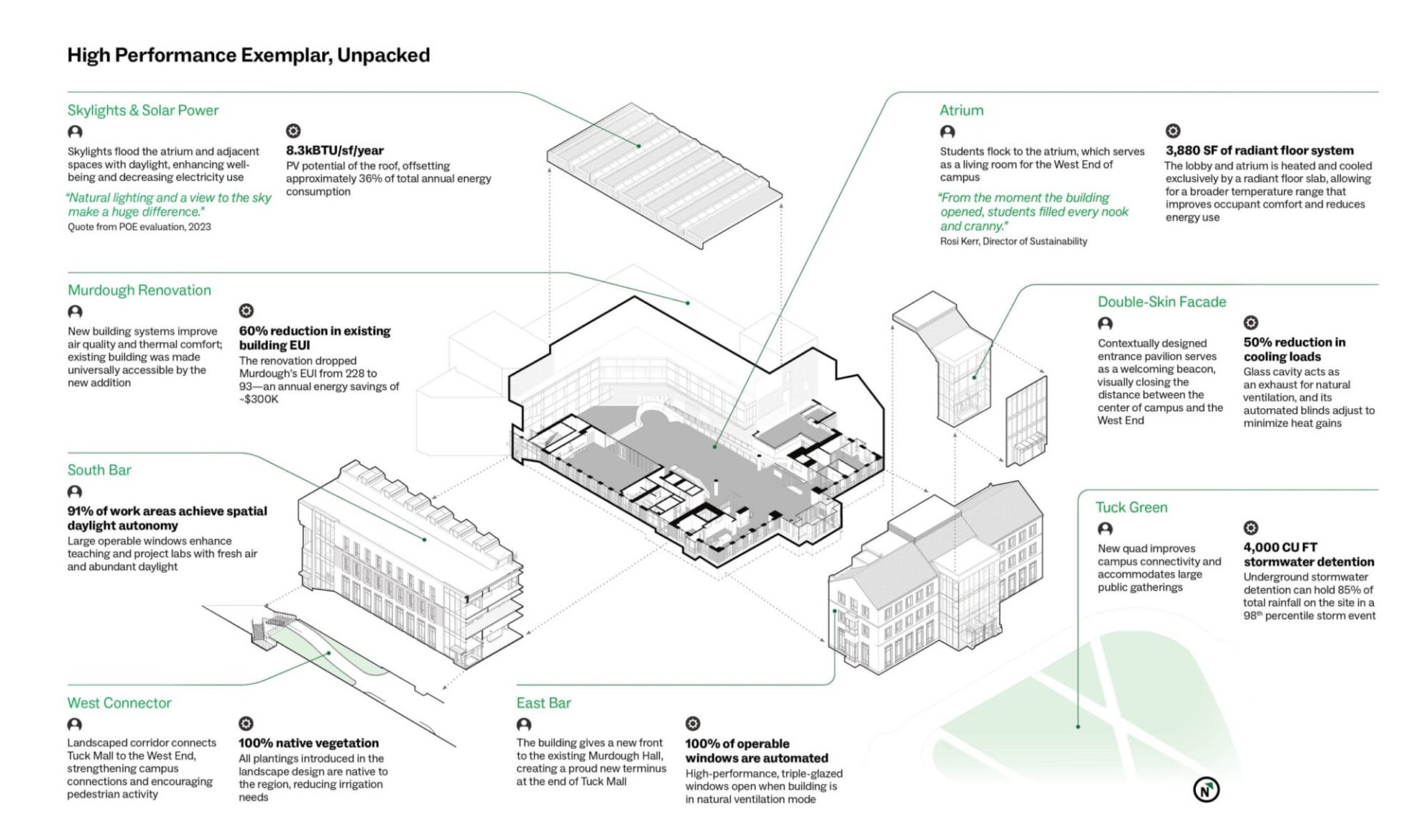As a historic campus with deferred maintenance and aging infrastructure, Dartmouth must dramatically reduce energy consumption of existing buildings and construct highly efficient new buildings to achieve its goals. The Irving Institute models a solution to simultaneously tackle both challenges; it combines a low-EUI addition to a c.1970s academic building with renovations that improve the existing building’s energy performance and accessibility.