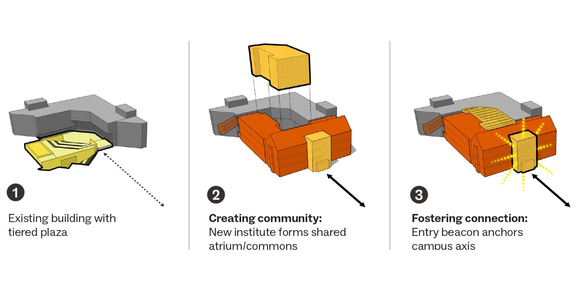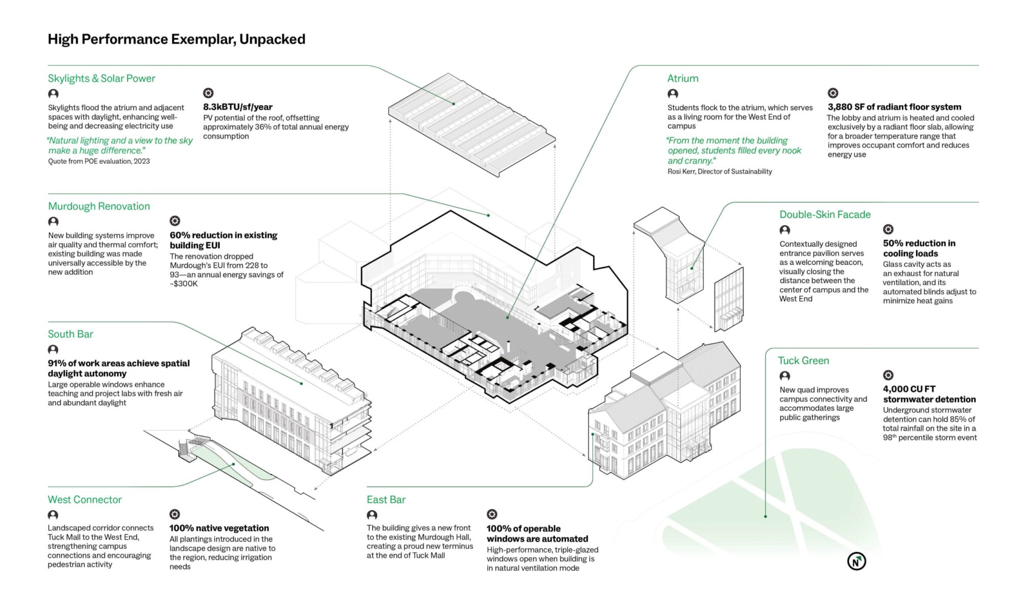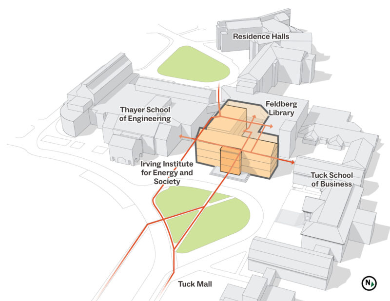 The building and site forge new academic and physical connections. Sitting directly between Tuck School of Business and Thayer School of Engineering, the Institute is the programmatic mixing valve of the new West End Innovation District; it brings together students and faculty from both of these schools to participate in shared research.
