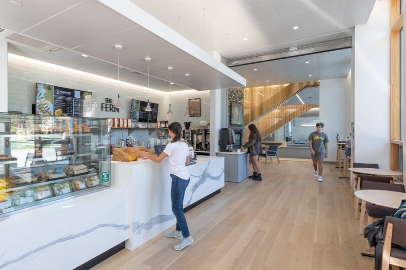Before this project, the west end was inaccessible and lacked a community heart. Today, the Institute building and its site provide accessible, equitable routes through the district, and its atrium has been dubbed the “living room” of the west end. Abundant daylight, natural ventilation, and radiant heat and cooling make for a truly comfortable environment; it welcomes hundreds of students each day to its café and sunlit spaces.