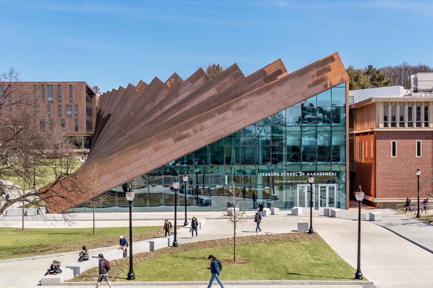 Prominently situated on Haigis Mall near the campus entrance, the striking copper and glass form is defined by a cascading, domino-effect appearance. The addition connects to the existing building in a loop around a courtyard, consolidating Isenberg’s faculty and staff under one roof and creating a strong visual identity and counterpoint to the neighboring Fine Arts Center. During the day, natural light peers between the rhythmic pillars to illuminate interior programs. In the evening, a compelling inverse relationship is revealed; the Business Innovation Hub glows from within and provides a lasting, inviting impression on the campus community.