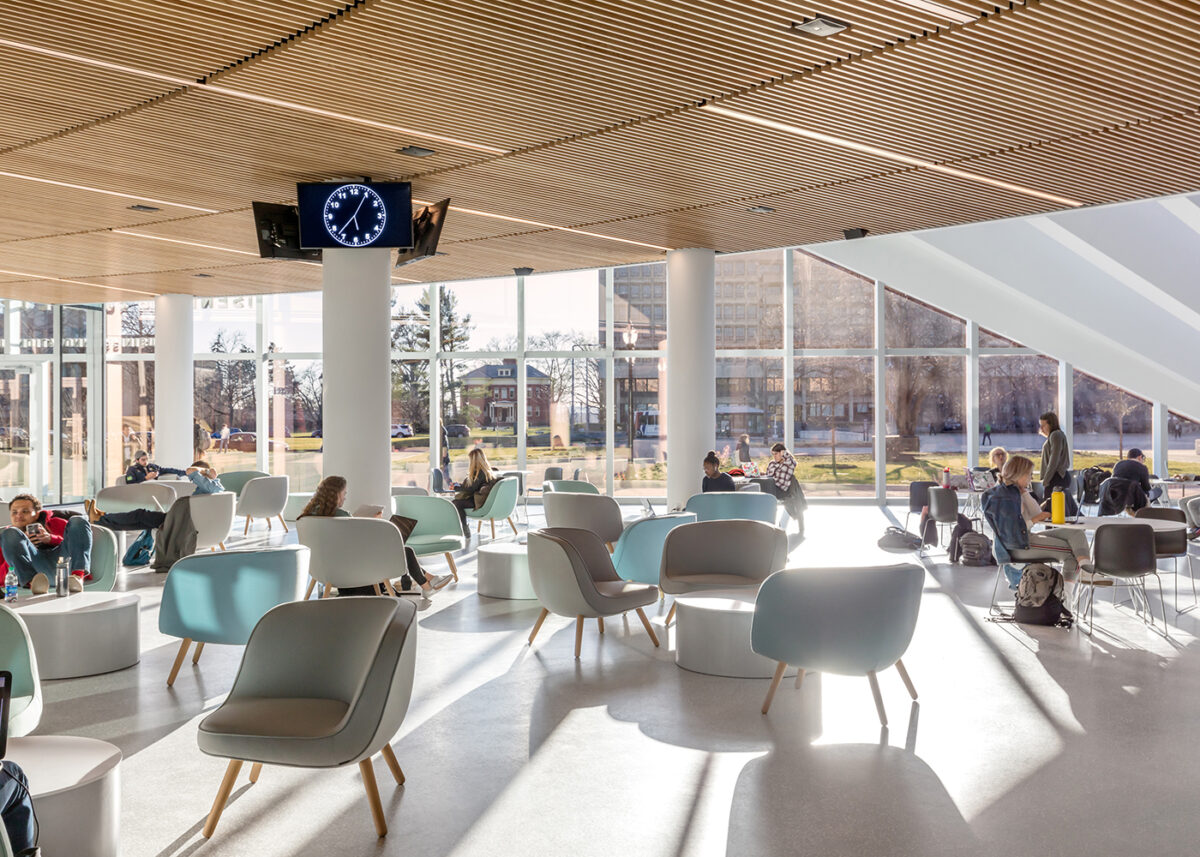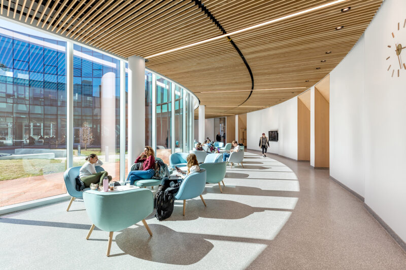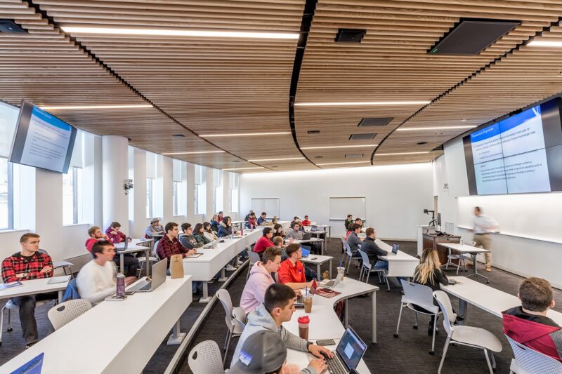 This expansion nearly doubles Isenberg’s capacity with hyper-collaborative study and social spaces that form a new Business Innovation Hub at the heart of campus. Every space was designed for student interaction: comfortable seating fills the sun-soaked corridors, classroom furniture easily reconfigures for lectures or small-group work sessions, and the heart of the complex—a multi-story Student Commons—doubles as an event venue for guest speakers, banquets, and career fairs. Interior programs surround an open-air courtyard that creates an oasis for collaboration and contemplation.