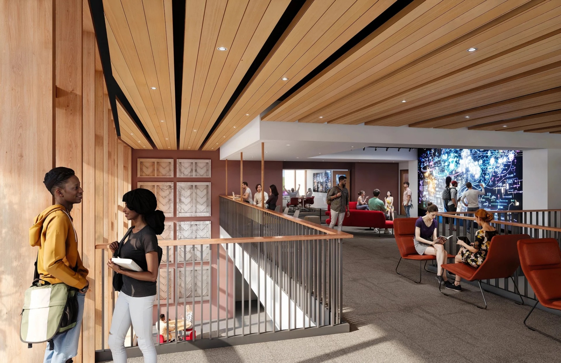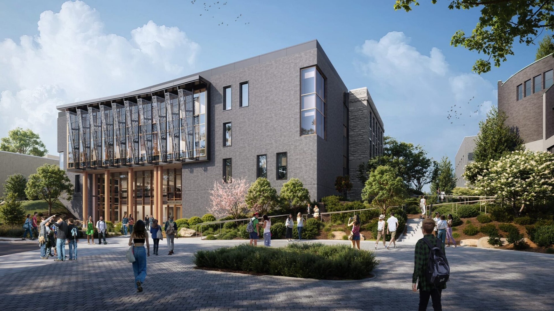The design concept—Quad to Woods, Woods to Quad—reconnects the building to its landscape. A new serpentine ramp links the North Quad to the Crum Woods and Arts Plaza, creating an accessible path through this part of campus for the first time. By consolidating the program into a more efficient footprint, Martin frees up green space and transforms an underutilized area behind the building into the new Arts Plaza—a pedestrian-friendly gathering place that strengthens ties to the Lang Music Building and Lang Performing Arts Center and encourages important new campus connections.