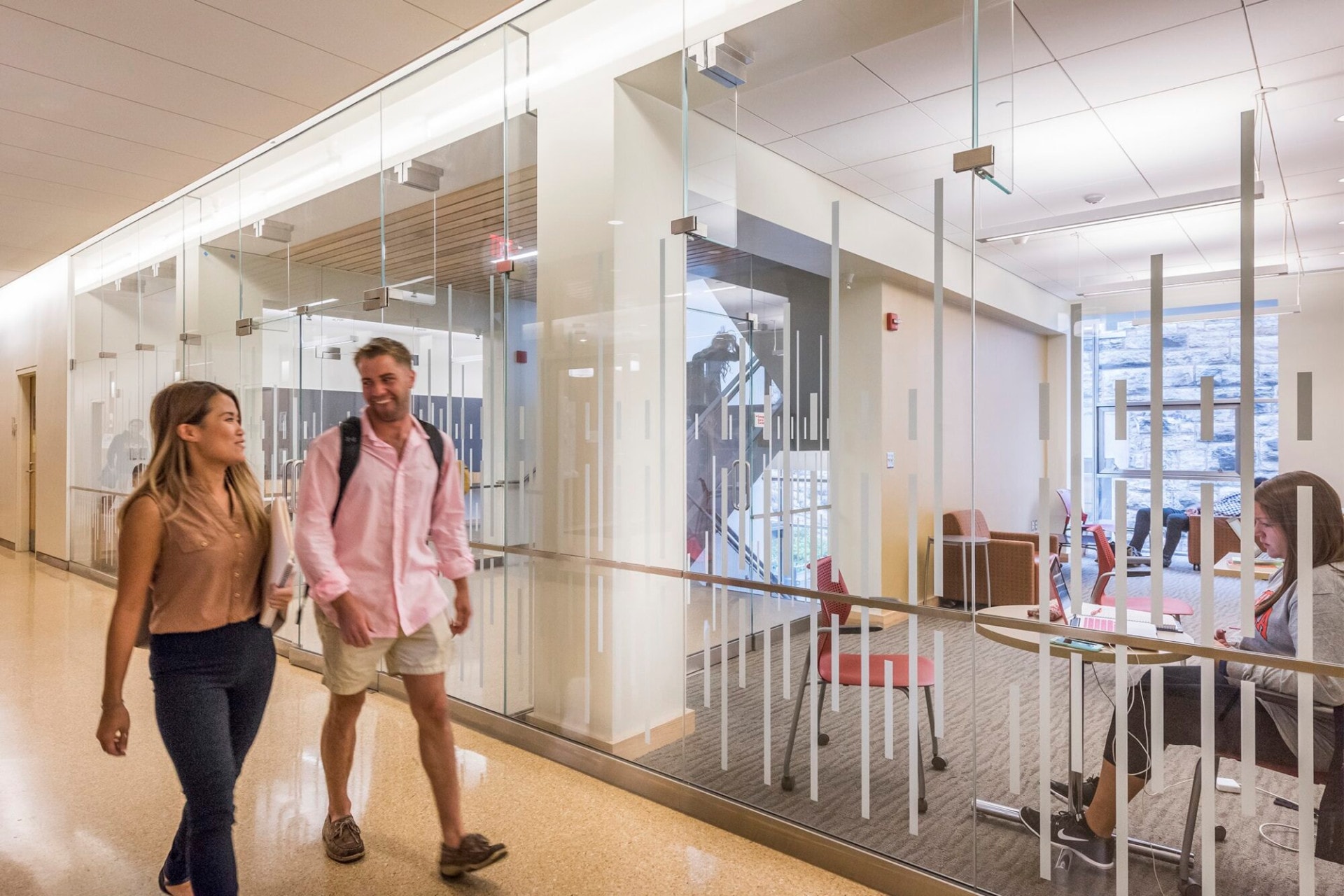 Today, a formerly opaque stair tower has been reskinned in floor-to-ceiling glass, drawing in abundant natural light and courtyard views to enliven these spaces and their occupants. Adjacent to the stair tower, new mid-corridor lounges are constantly full, providing students a much-needed space to study and reconnect in between classes.