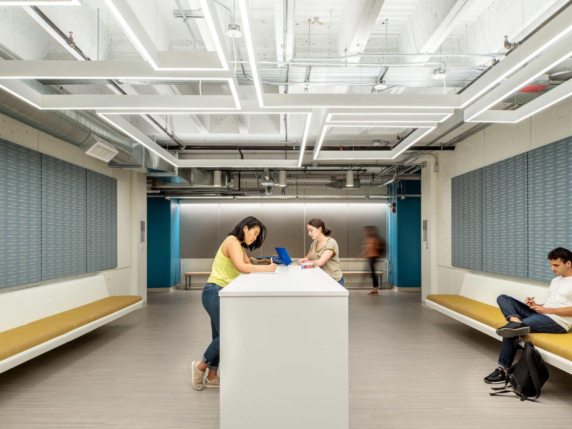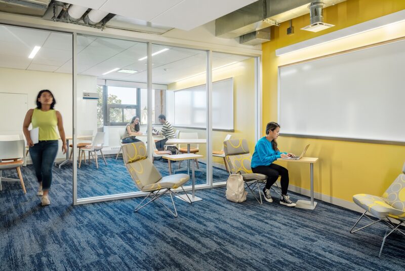 On the third floor, new Technology Enhanced Active Learning (TEAL) classrooms are each equipped with student “pods” centered around a touchscreen monitor. The addition of immersive technology supports collaboration and class participation, reinforcing the team-based active learning focus of the University. Cost-effective accent walls, energy efficient lighting, and new furnishings drastically improve the look and functionality of spaces for teaching and learning—inside and outside of the classroom.