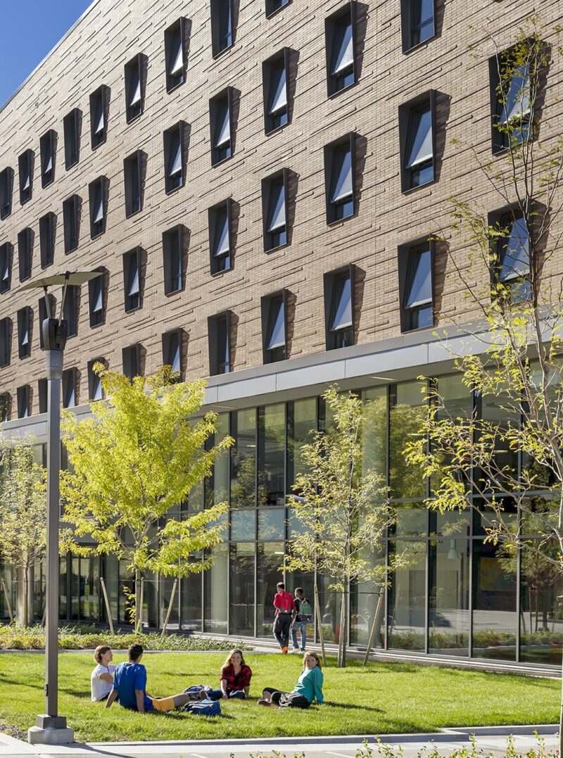 This new residence hall and dining facility grew out of its original design brief to become far more than just a residence hall; it inspired the creation of a new residential neighborhood and de facto student center. Prior plans sited this building to the north with parking between residence halls. We proposed an alternative—one that coalesces a residential precinct along a new public plaza and pedestrian pathway to inform a lively, mixed-use residential building and campus center.