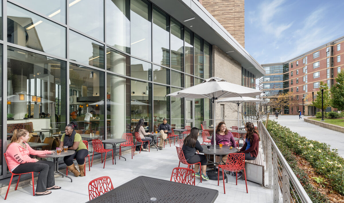 The design creates a connective, landscaped plaza lined with new dining, social, and recreational spaces at the ground level. Whereas the primary path from dorm to classroom used to cut unceremoniously through a parking lot, students now travel easily between residence halls and nearby academic buildings. The plaza itself has become a well-programmed campus space, hosting events ranging from rock concerts to sustainability fairs. Landscape elements echo the bucolic environment of the campus, while strategically retaining rainwater on site.