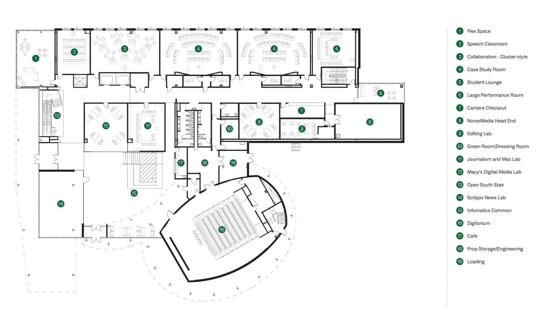 With little precedent for a building with this mix of programs, the Center for Informatics is unique in providing a space that integrates technology and the arts, allowing it to support technically skilled students with a broad range of other interests and capabilities. Today, Griffin Hall is a vibrant campus facility enriched by state-of-the-art labs and studios, inviting collaboration spaces, and immersive experiential learning environments, including the “Digitorium,” a flexible, tech-rich, two-story space that hosts a range of interactive experience for gaming, simulation, performance, teaching, and research.