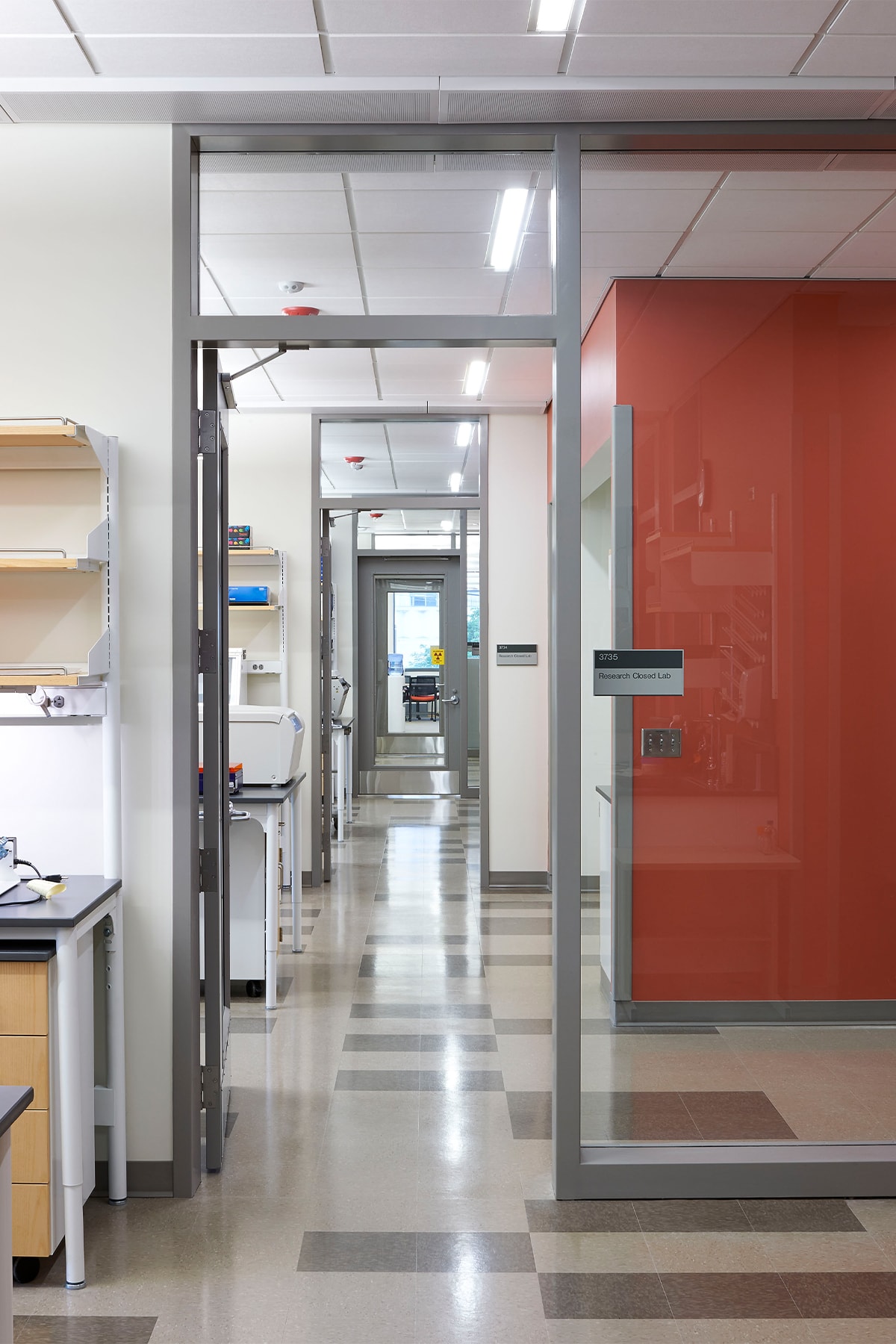Wet and dry laboratories are planned to support molecular biology and neuroscience research. The original building’s labs were based on a “closed” room model which limited their ability to adapt to changing research programs. The NRB uses both open and closed lab models that are designed so they can flip; any lab that is open can be changed in future. Plug-and-play casework and ceiling quick-connects further enable flexibility for program shifts over time.